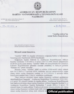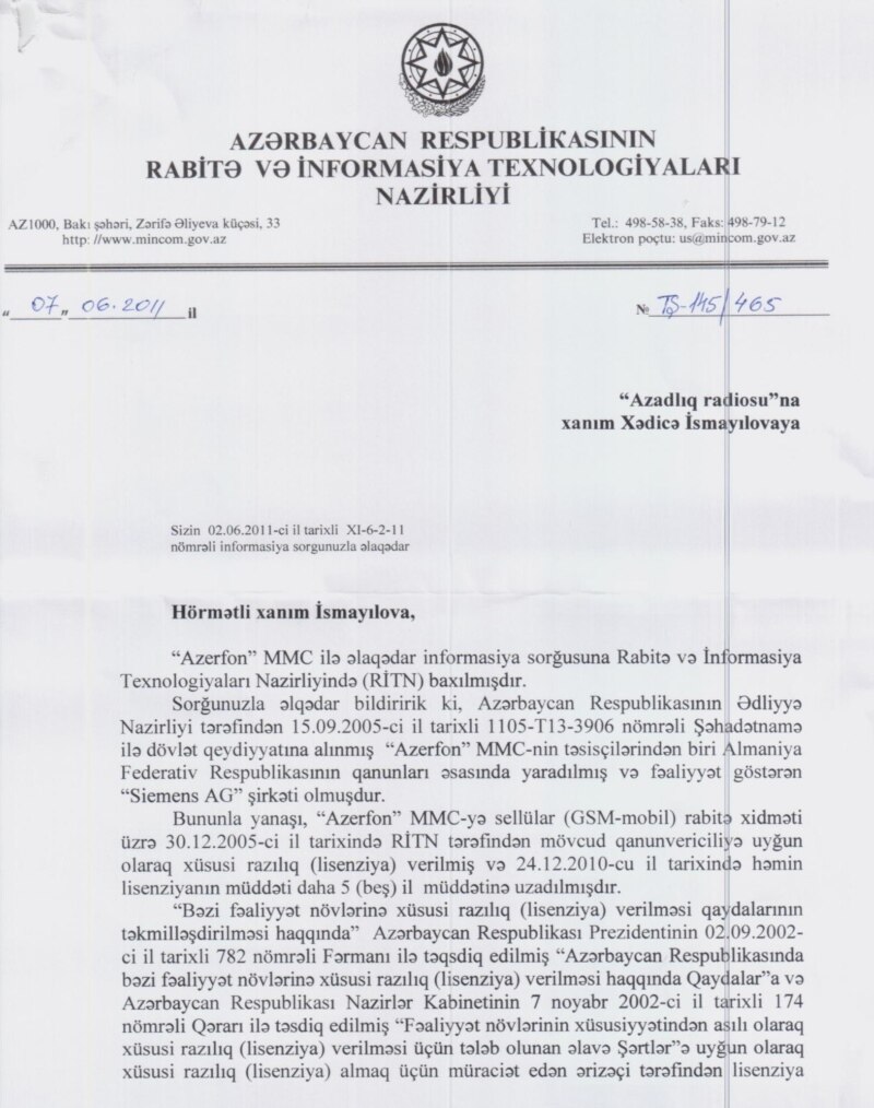 Rabitə və İnformasiya Texnologiyaları Nazirliyinin AzadliqRadiosunun sorğusuna rəsmi cavabı, 7 iyun 2011